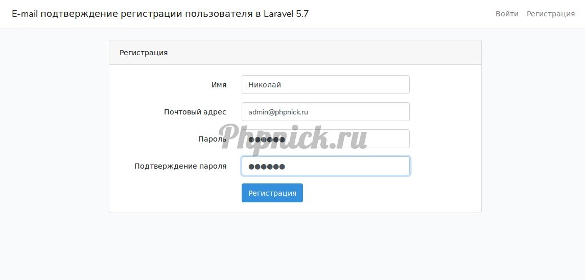 Теперь перейдем на страницу регистрации (адрес_сайта/register) и заполним форму регистрации, после чего нажмем на кнопку "Регистрация".